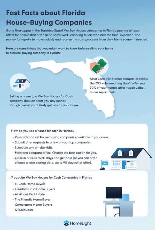 - Fast sale: The best companies that buy houses for cash in Florida can help you sell your home in as few as seven days without repairs, showings, or hassles.