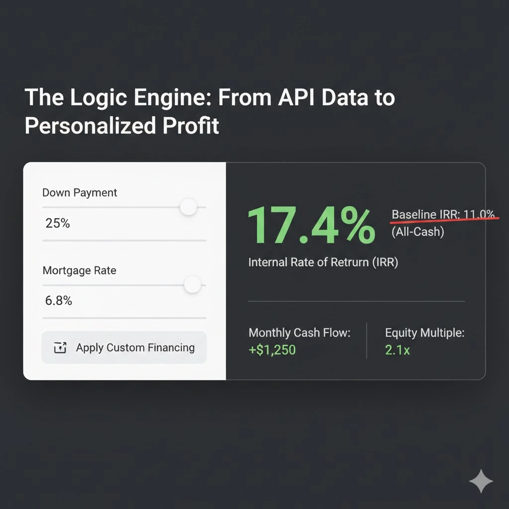 - Contextual Recalculation: The engine recalculates the cash flow and internal rate of return (IRR). For example, a property with an 11% baseline IRR (cash purchase) is instantly recalculated to 17.4% based on the user’s specific leverage.