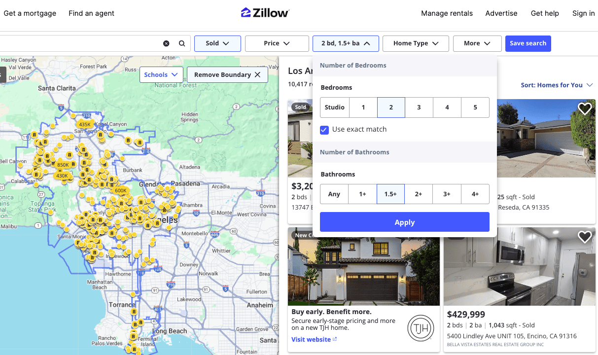 - Now, filter by the number of bedrooms and bathrooms and check the box “Use exact match.”