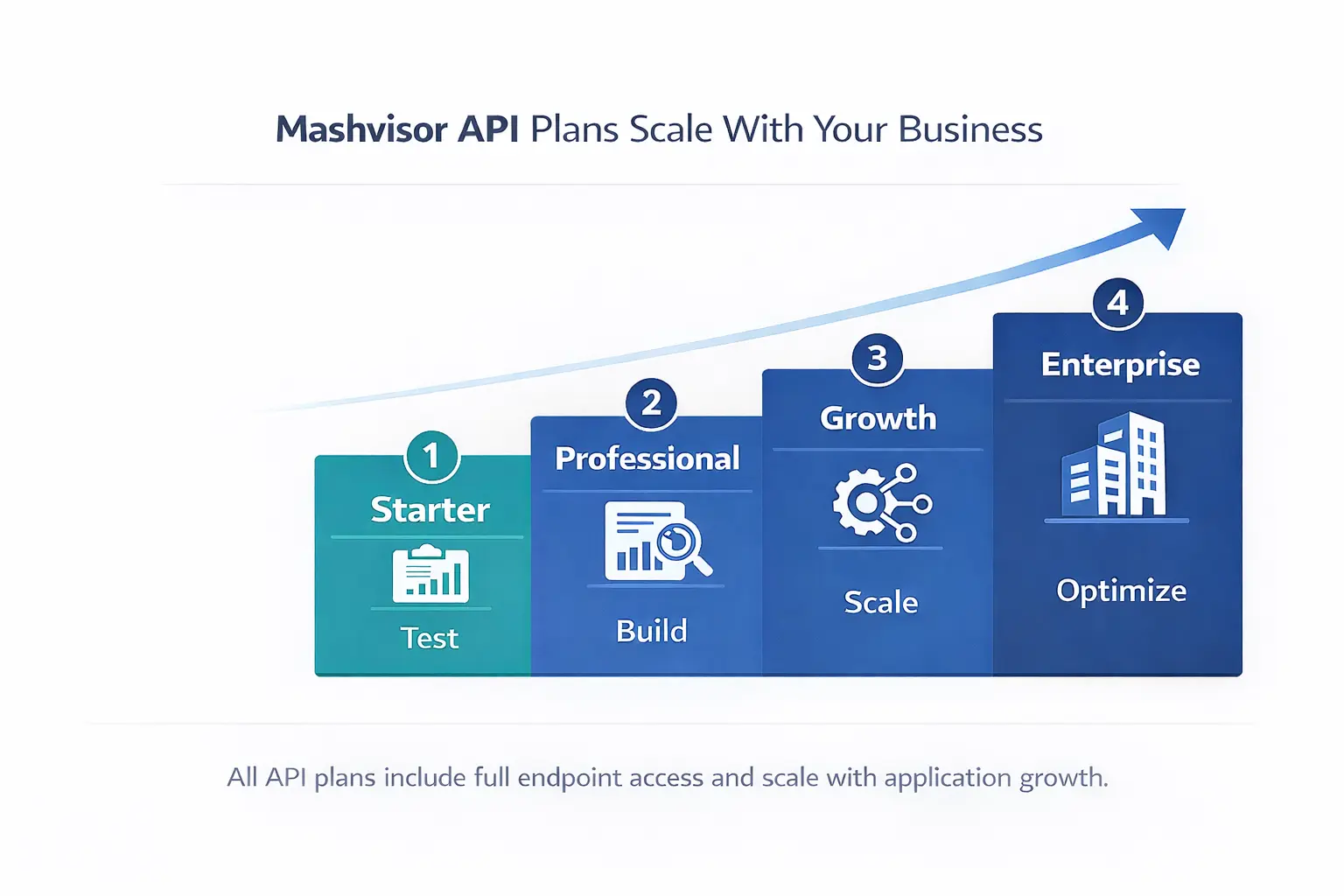 Once you estimate your usage, you can align your expected request volume with the available Mashvisor API pricing tiers. Because all plans include full endpoint access, the decision primarily depends on scale rather than functionality.